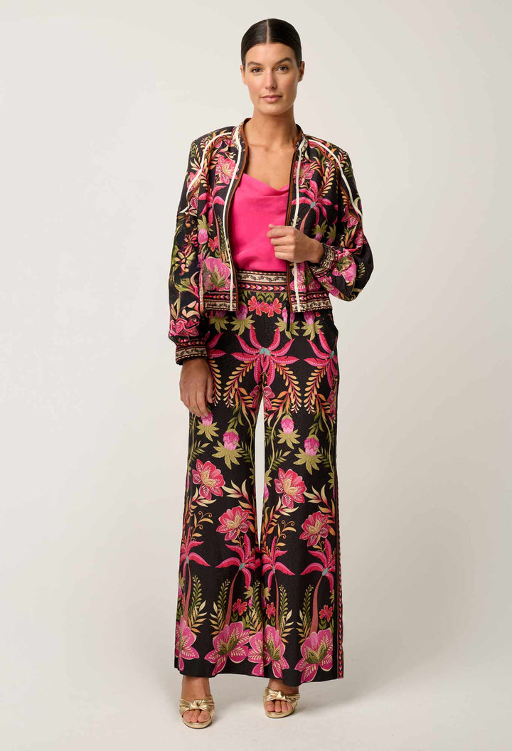 Elevate your outerwear game with the Arabella Reversible Viscose Jacket, a luxurious and versatile statement piece crafted in a lightweight viscose dobby fabric. Featuring a bold Anthos Lótos floral placement print on one side and a sleek, minimal Black base with contrast binding on the other, this jacket offers two looks in one—effortlessly transitioning from vibrant to understated.