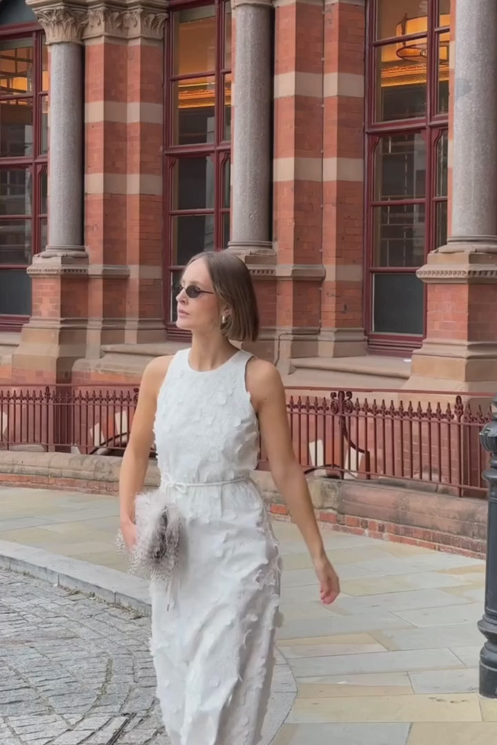 the dusk dress is shaped with a high rounded neckline and sleeveless fit-and-flare profile. a waist seam with a self-tie belt refines the shape, while a midi length adds polish to everyday outfitting. finished with an invisible zip and covered button closure at the back, it’s a modern piece designed for versatility.