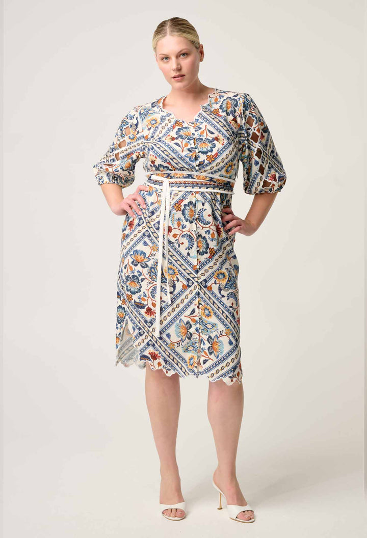 Showcasing our exclusive Petinos Floros print — a vibrant blend of Mediterranean-inspired florals and intricate motifs in rich saffron, cobalt blue, and soft ivory — Theia offers timeless appeal with modern detailing. The wrap-style bodice defines the waist, while delicate scalloped embroidery along the hem and sleeves adds artisanal charm and texture.