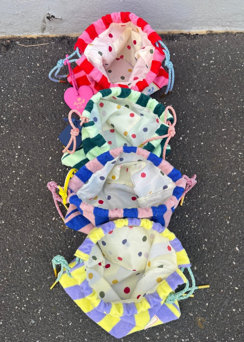 Made from soft terry towelling in bold royal/musk stripes, it’s the perfect grab-and-go accessory for beach days! Lined in a natural cotton multi coloured polka-dots.
