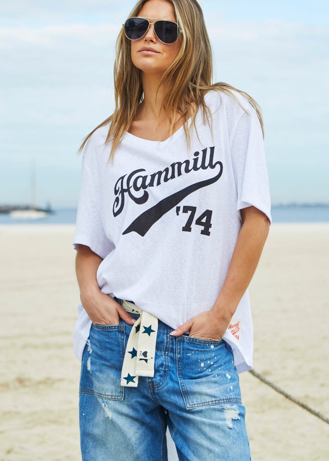 Oversized best selling V neck tee in white with washed black Hammill '74 logo print on the front.