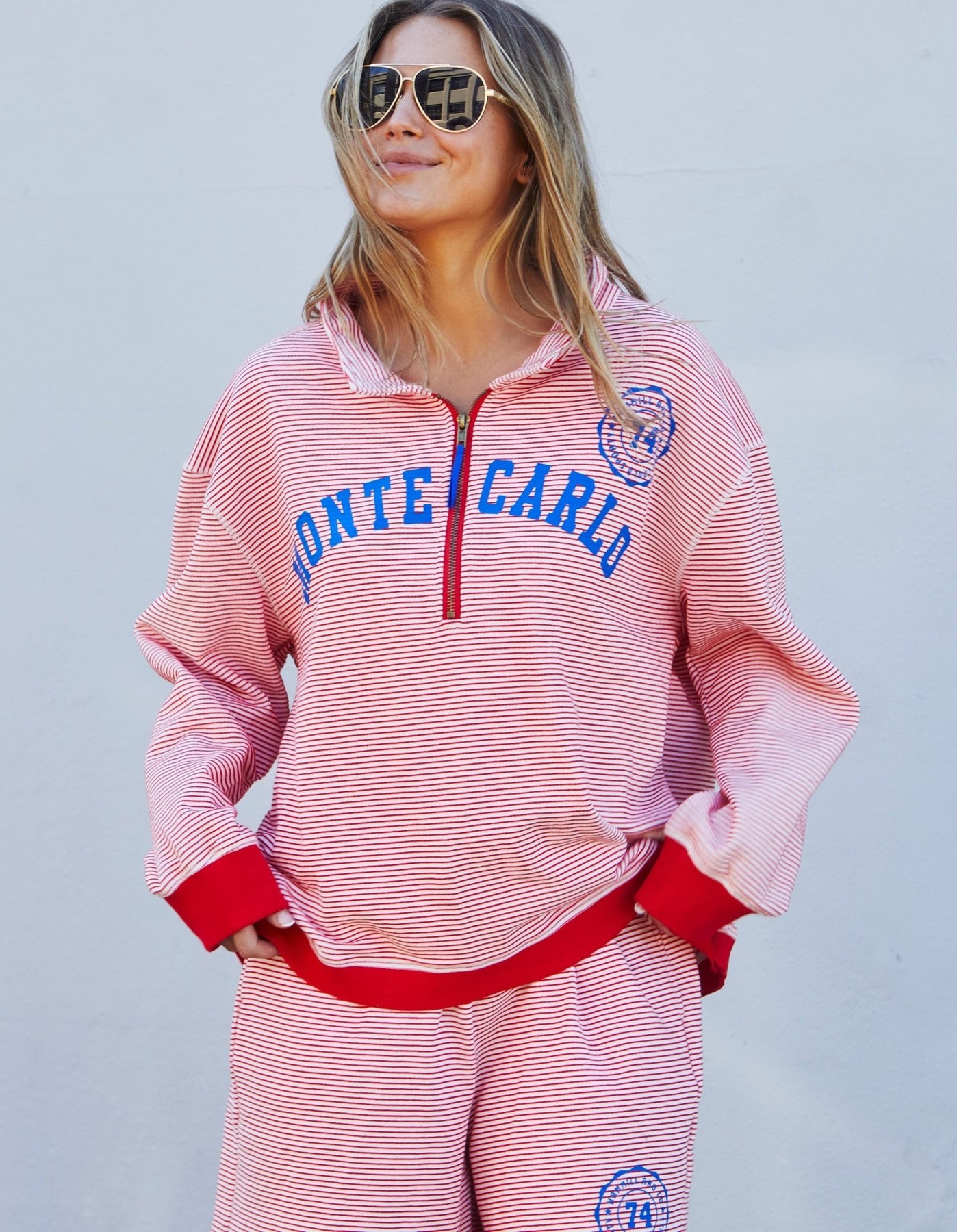 Red and white fine-stripe half-zip sweat with Monte Carlo lettering in bright blue across the chest and a small logo graphic on one side. The zip neckline features a contrast red placket, and the ribbed cuffs and hem in solid red add structure to its relaxed shape.