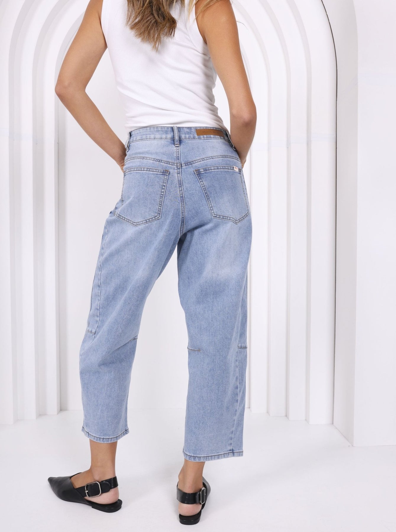 Characteristics of Toni Barrel-Leg Jeans include a fitted waist, flared-out shape around the mid-leg, and tapered silhouette at the bottom, which exudes the look of, well, a barrel. It's the vibe of a cowboy ready for a showdown in the Wild, Wild West!!!