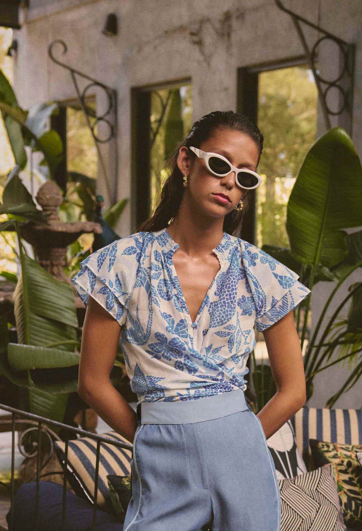 Elevate your everyday style with the Calandra Silk Cotton Flutter Sleeve Top in Azure Mosaic. Crafted from a luxurious blend of silk and cotton, this lightweight blouse offers the perfect balance of breathability, softness, and a subtle lustrous finish. The striking Azure Mosaic print brings a fresh pop of colour to your wardrobe, while the flutter sleeves add a feminine, romantic touch that moves effortlessly with you.