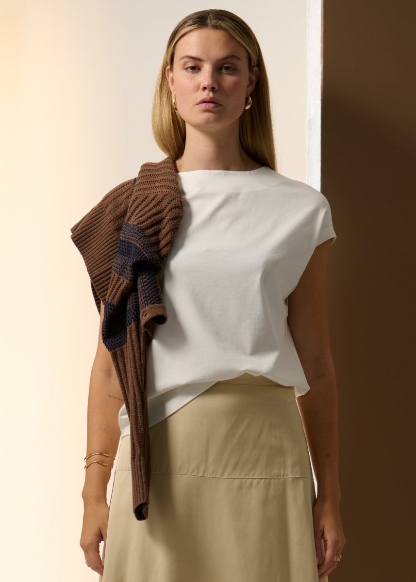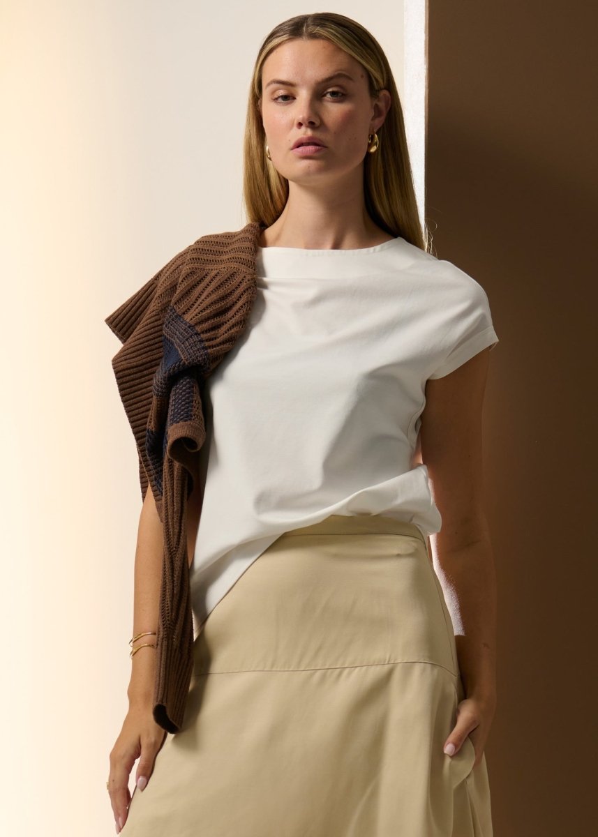 Inspired by our bestselling Mast Tee, the Odie Tee is made from an elevated, drapey jersey with a knitted detail at the cuffs.