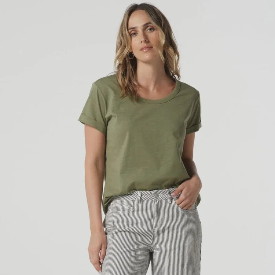 The Rhodes Tee featuring in Sage with a round neckline, a rolled sleeve, in a classic fit.