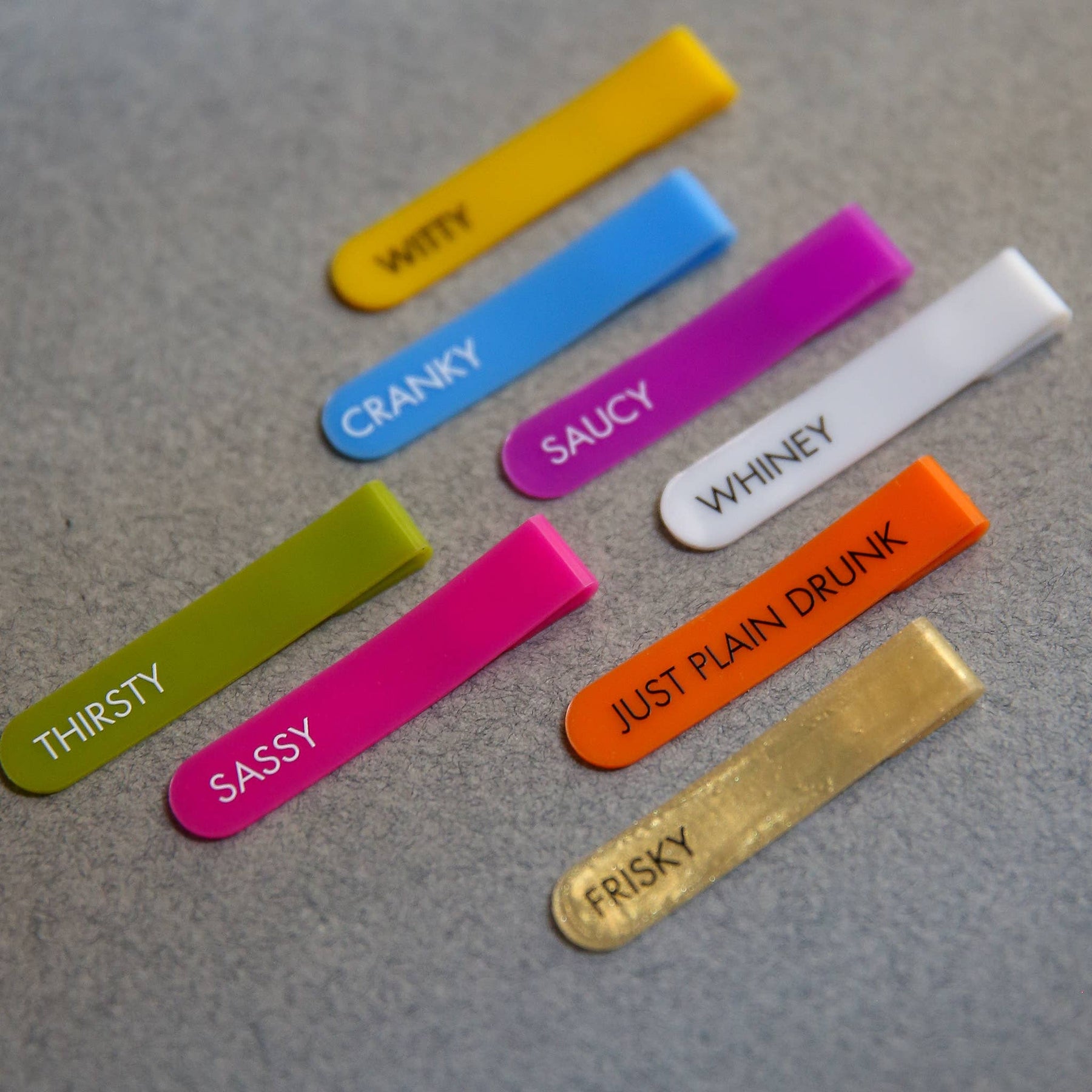 GlassWhere Reusable Wine Glass identifiers make it easy to claim your wine glasses with style and humor. Silicone ring sticks to the rim of your beer glass, martini glass and stemless wine glass and won't fall off and won't rattle when swirling your glass • Use a ballpoint pen to write your name, no special markers necessary; wipes off for reuse • Each set contains 8 glass identifiers with funny slogans; easy to clean, simply rinse with warm water if dusty or dirty • Witty, Sassy, Cranky, Frisky, Whiney, Saucy, Thirsty, Just Plain Drunk! • Makes a great hostess gift or stocking stuffer Founded by wine and food industry veterans Walt & Maire, CapaBunga creates functional products inspired by California’s wine country living, enhancing the way you shop, cook, dine, and entertain.