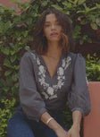 Inspired by Mexican embroidered peasant blouses, this pretty blouse has flower & butterfly motifs in thick cotton satin stitches. Features feminine open neck & three quarter length sleeves